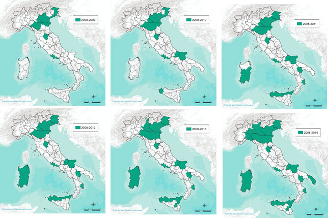Figure 3a.Distribution of West Nile Virus in Italy (Years 2008–2014)
