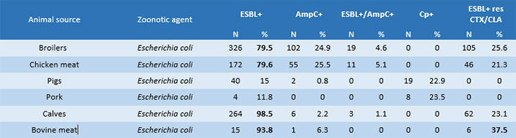 - The high prevalence of E. coli with ESBL+ phenotype in calves (< 1 year) (98.5%), a similar figure in beef (93.8%), with increasing presence of ESBL+ isolates co-resistant to clavulanic acid and cephalosporin third generation ceftriaxone in beef (37.5%). Also in the Italian pig and poultry sectors the prevalence of ESBL producers is at extremely high levels (pork: 88.2%; fattening-pigs: 85%; broilers and chicken meat: 79.5%). On the other hand, there isa low prevalence of AmpC+ and AmpC+/ ESBL+ phenotypes in compartments of Italian livestock production (Table 1).