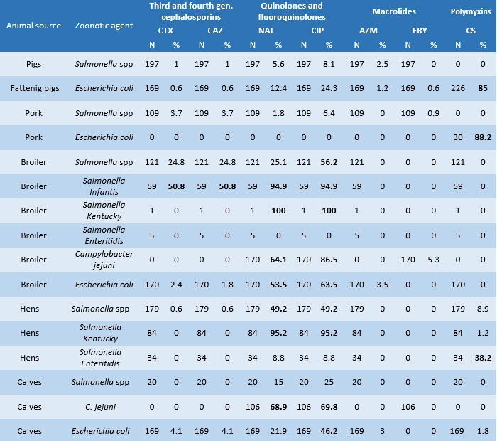 - Regarding the prevalence of resistance to critical antimicrobials (Table 2), Salmonella Kentucky (100%) and Salmonella Infantis (95%) acquired greater resistance in turkeys and broilers, reaching saturated levels against quinolones and fluoroquinolones; results are lower but still high for the same classes in Campylobacter jejuni isolates (64% and 87%) and Escherichia coli (53.4% and 64%) in chicken carcasses. In calves, there is an increase in C. jejuni isolates resistant to quinolone nalidixic acid (68.9%) and fluoroquinolone ciprofloxacin (69.8%) and E. coli isolates resistant to ciprofloxacin (46.2 %). There is a better situation regarding Salmonella spp. and E. coli in Italian pig farming. Finally, in egg production, Salmonella Kentucky, as in broiler chicken, is the serovar that has acquired critical resistance levels (95.2%), toboth nalidixic acid and ciprofloxacin. The Salmonella Enteritidis serotype, on the other hand, shows a worrying level of resistance to colistin (38.2%).