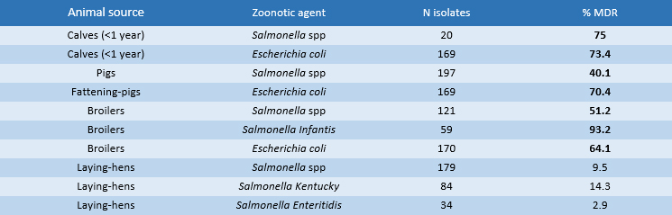 Regarding multi-drug-resistance (MDR) (i.e. strains not susceptible to at least three classes of antimicrobials) (Table 3) in zoonotic strains isolated in calves, there is an extremely high prevalence of the MDR+ phenotype in Salmonella spp. (75%) and in Escherichia coli (73.4%). In fattening-pigs, the prevalence of MDR+ phenotypes in E. coli isolates is 70.4% while in Salmonella spp. the MDR level is 40.1%. In both livestock sectors, cross-resistance concerns ampicillin, sulfamethoxazole and tetracycline. In broilers, Salmonella Infantis predominates with a resistance level of 93.2% while lower levels are recorded for the MDR+ isolates of E. coli (64%) and Salmonella spp. (51%). Multi-resistance concerns ampicillin, ciprofloxacin, sulfamethoxazole, trimethoprim and tetracycline. There are optimistic results in the laying hens sector as MDR+ levels are not reached i.e. resistance for each indicator species does not cover more than two antimicrobial classes: Salmonella spp. and Salmonella Kentucky reach high resistance levels only for quinolones and fluoroquinolones 49.2% and 95.2% in both categories, respectively. The serovar Salmonella Enteritidis shows high resistance only to polymyxins (38.2%).
