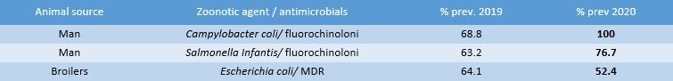 - an extremely significant upward trend in resistance to fluoroquinolones for Campylobacter coli in humans, up to saturation levels (in 2019 it was 68.8% while in 2020 it was 100%);