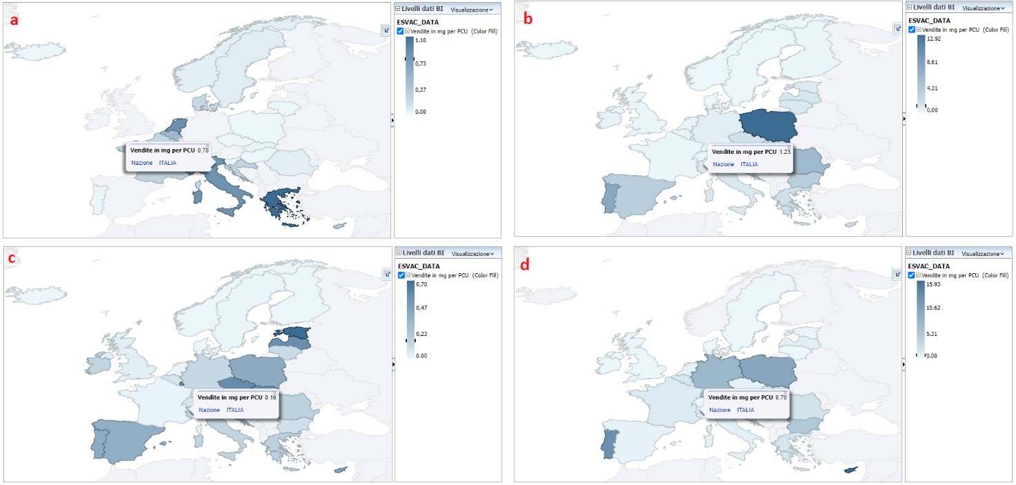 Figure 1. Territorial distribution of sales of quinolones (a), fluoroquinolones (b), third and fourth generation cephalosporins (c) and polymyxins (d) for food producing animals, in mg / PCU, in Italy, for 2020 [4]
